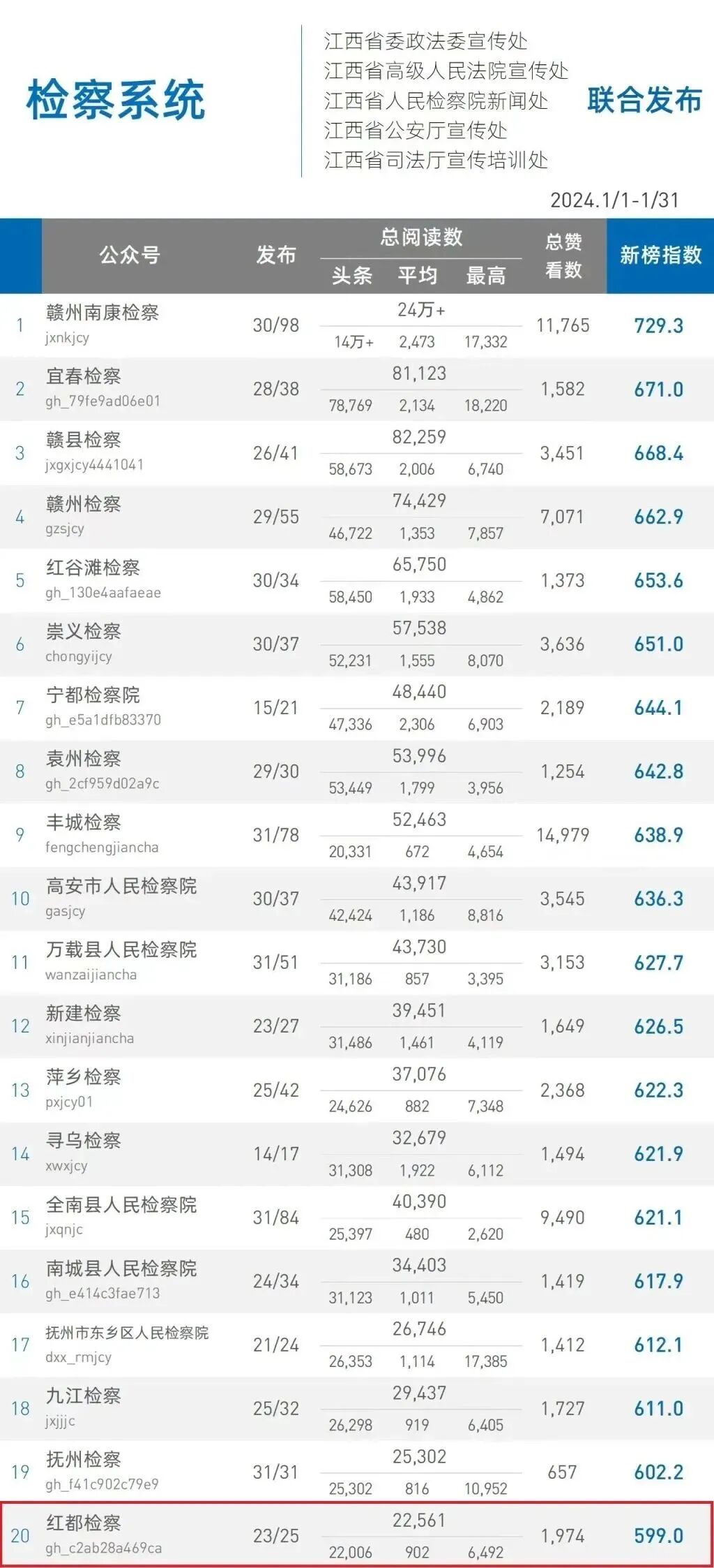 2024年2月18日,江西政法系统微信影响力1月份排行榜发布。红都检察微信公众号进入江西政法系统微信影响力检察系统月排行榜前20强。
