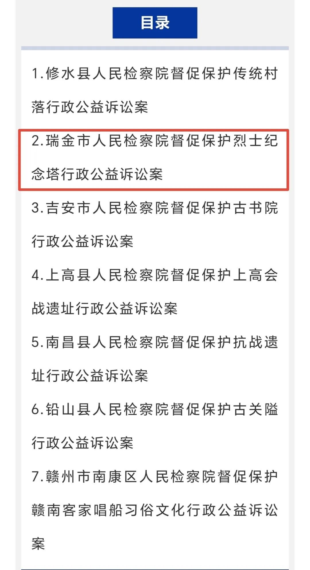 9月12日,江西省人民检察院发布“全力配合开展‘公益诉讼江西行’助力守护‘文化瑰宝’”典型案例,瑞金市人民检察院办理的督促保护烈士纪念塔行政公益诉讼案入选典型案例。