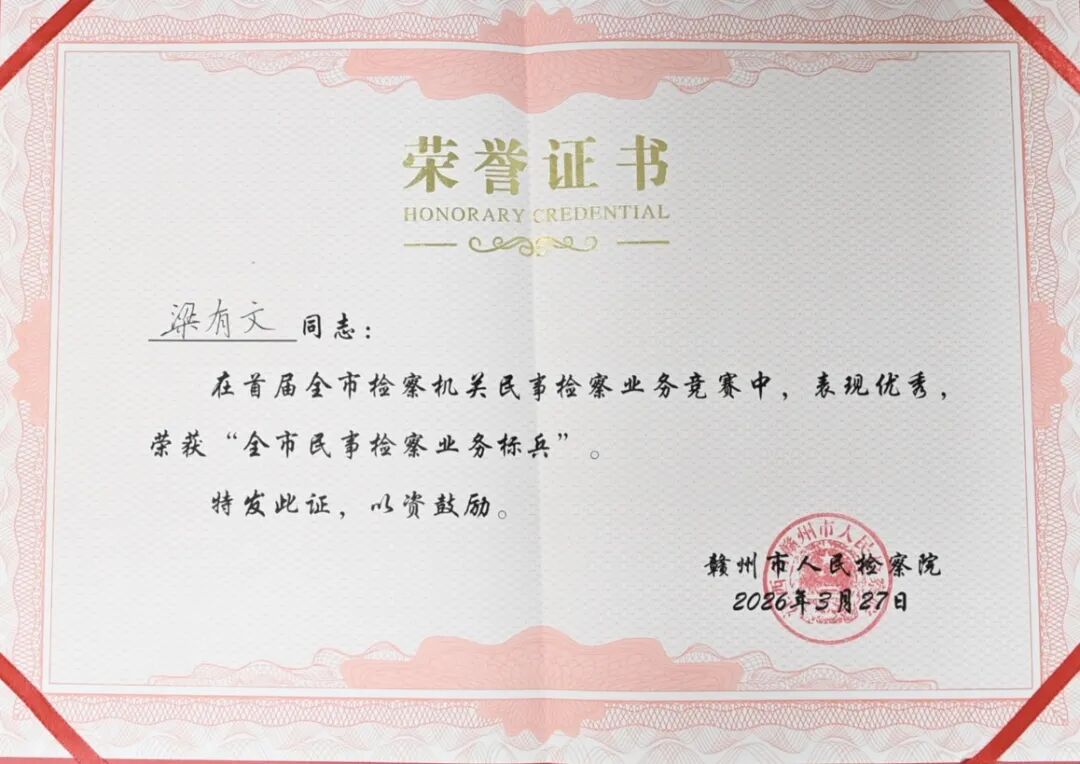 2026年3月27日,在首届全市检察机关民事检察业务竞赛中,我院第二检察部主任梁有文同志荣获“全市民事检察业务标兵”称号。